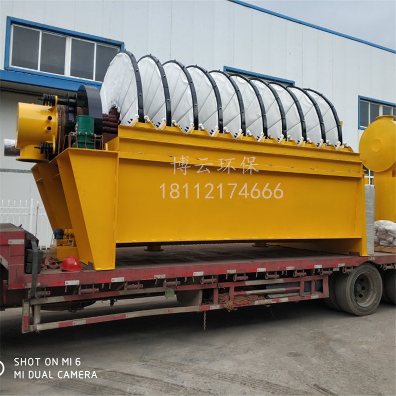 盤式真空過濾機(jī)由各個(gè)單獨(dú)的扇形片的圓盤構(gòu)成。每一個(gè)扇形片為 單獨(dú)的過濾單元,由濾布做成布套在扇形片上形成濾室。過濾盤由電機(jī)通過減速器及開式齒輪傳動來驅(qū)動 ,過濾盤順時(shí)針方向轉(zhuǎn)動,濾室里的礦漿在吸附區(qū)借助于真空泵在過濾介質(zhì)兩側(cè)形成的壓力差,附著在過 濾盤上形成濾餅后,攪拌器旋轉(zhuǎn)防止固體沉淀,濾餅離開液面后,在真空作用下繼續(xù)脫去水分。濾液透過 濾布,經(jīng)過濾液管,從分配頭排出。濾餅在卸料區(qū)由反吹風(fēng)卸料落入排料槽,整個(gè)作業(yè)過程連續(xù)循環(huán)進(jìn)行 。